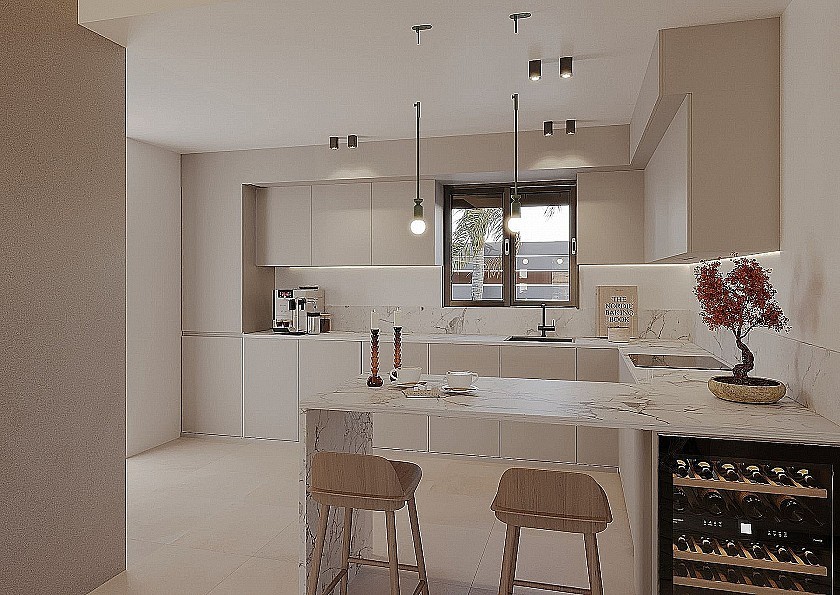 Fully fitted with upper and lower units up to the ceiling, Silestone or similar countertop with sink and monobloc tap, pre-installation for appliances, island formation, and ceramic backsplash of your choice from premium-quality options.
