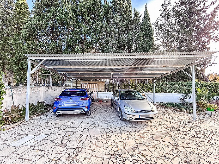 Outside, the property boasts a private 10 x 4 m swimming pool, perfect for enjoying the Mediterranean climate. The main plot also includes a carport with space for three vehicles, a barbecue area, and ample open space suitable for recreation or landscaping. The house has mains drinking water, well water for irrigation, and mains electricity, providing comfort and independence.