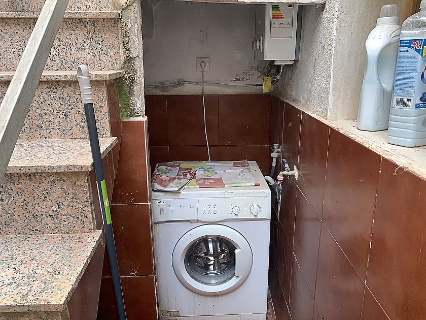 Further along we have the family bathroom with shower, and then the back door that leads out to a small terrace with utility area situated under the stairs to the first floor, with the gas heater for hot water, and the washing machine.