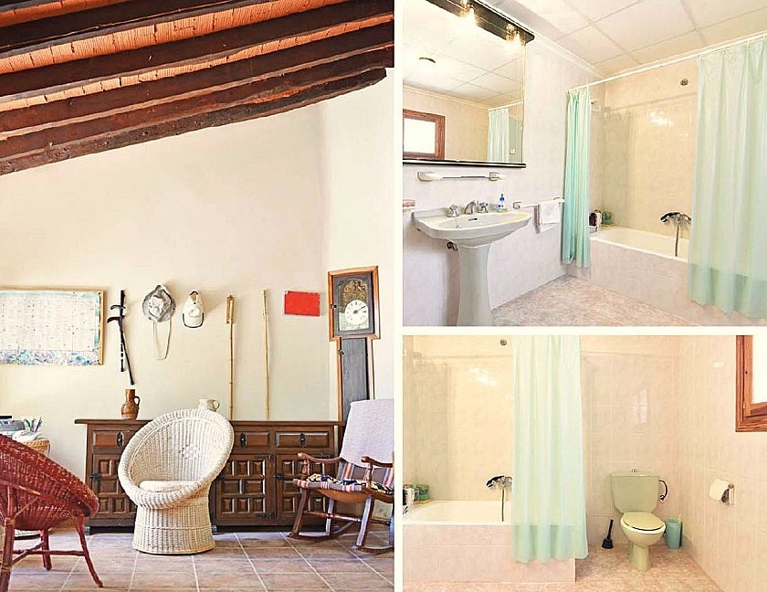 À l'intérieur, vous trouverez de charmants coins repas, dont certains pourraient facilement être transformés en salons confortables. Bien que la maison nécessite quelques rénovations, elle est entièrement habitable et a conservé de magnifiques éléments traditionnels espagnols.