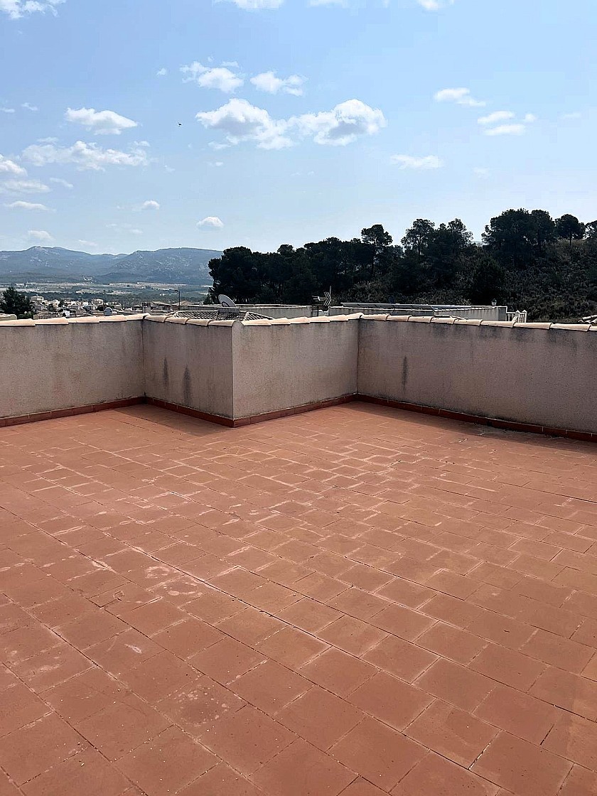 Een dakterras met een panoramisch uitzicht op het omliggende landschap en het majestueuze Maigmó-gebergte