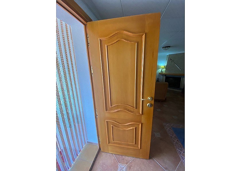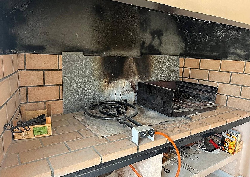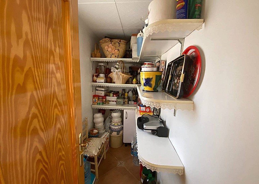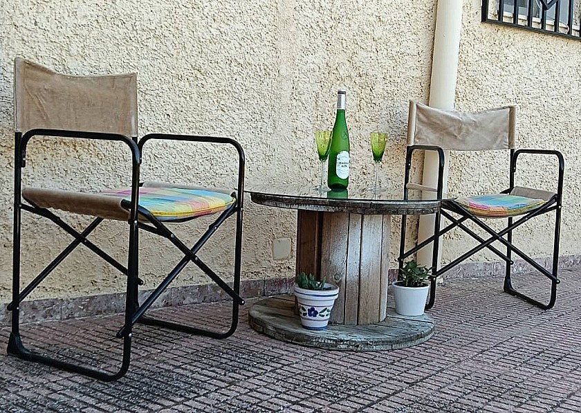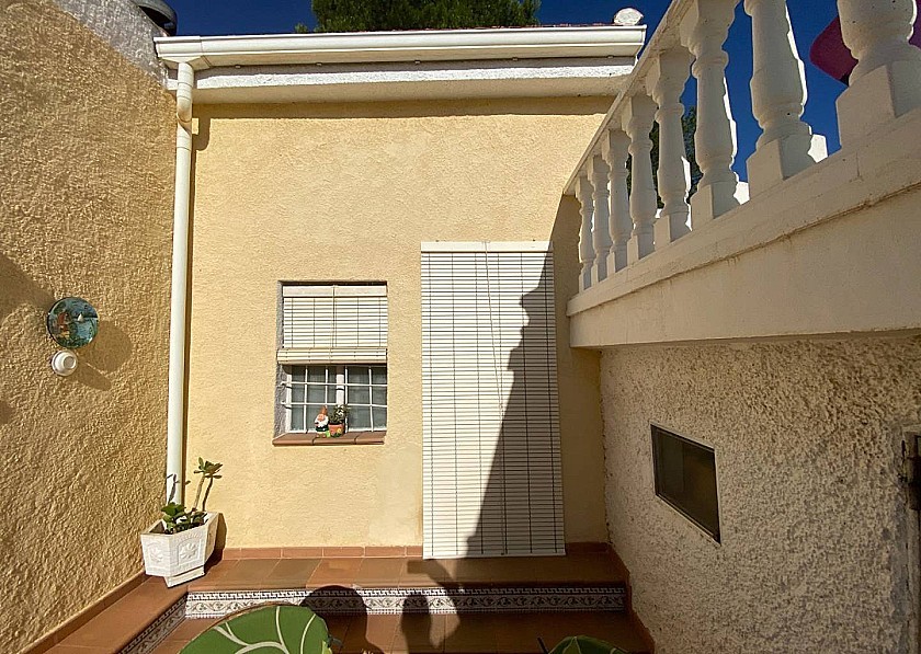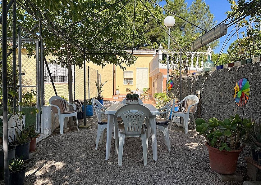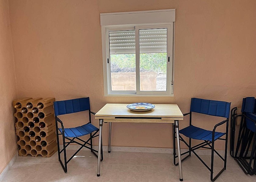 Tegenover de ingang bevindt zich nog een kleinere metalen deur, die, als je hem openzet, de opbergruimte voor de pomp en het filter van het zwembad en nog meer ruimte voor sterke spullen laat zien. Een klein terras met een tafel en stoelen biedt de mogelijkheid om buiten te eten.