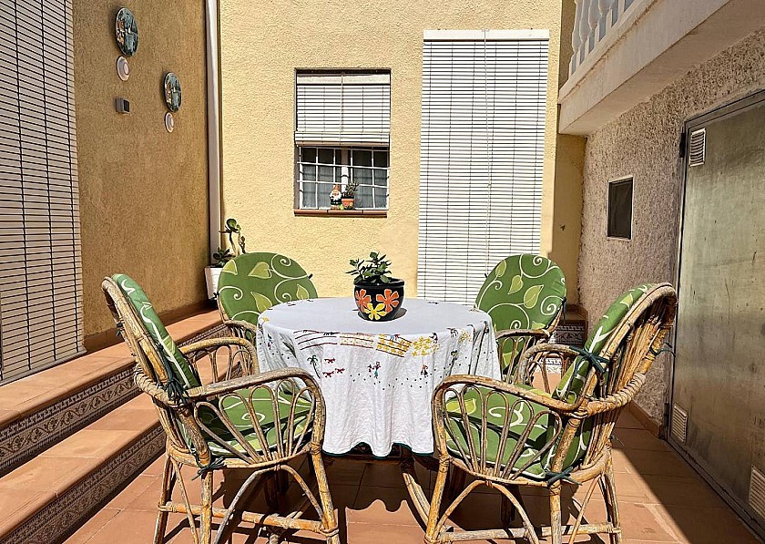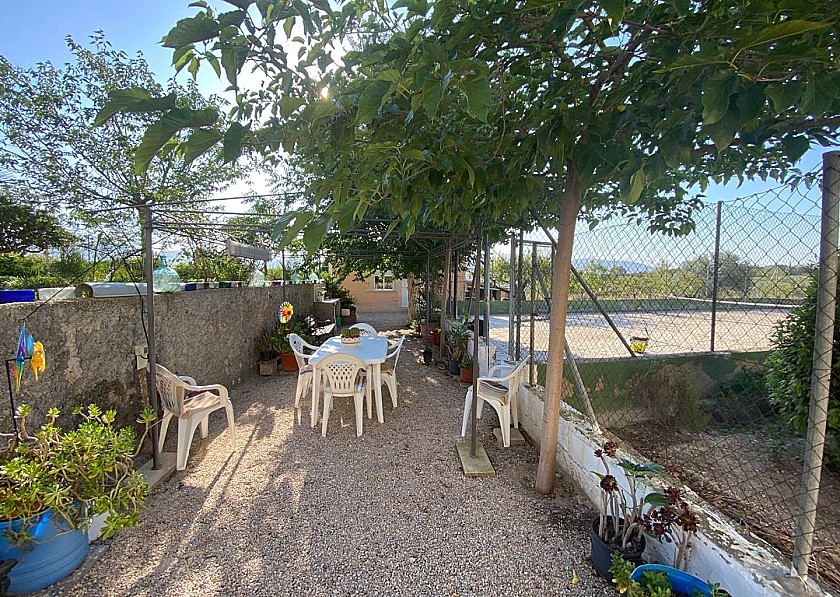 Het overdekte terras bij de ingang is ruim en prachtig aangelegd met een fantastisch uitzicht over het terrein aan de linkerkant en over het zwembad en het verhoogde terras aan de voorkant. Er is voldoende ruimte voor een grote eettafel en stoelen.